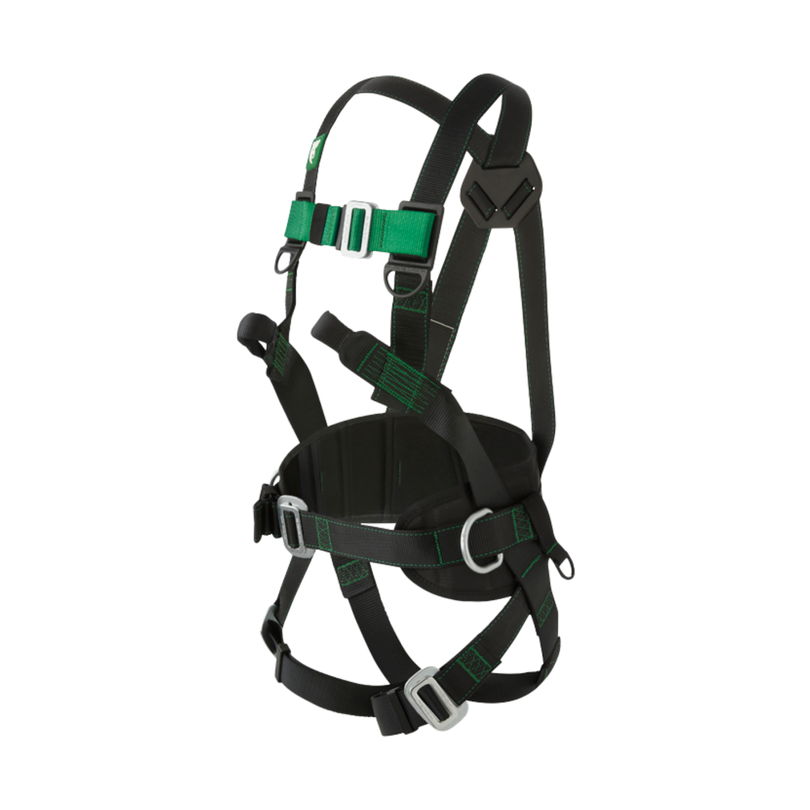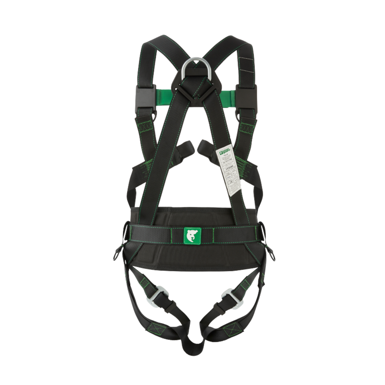 Designul ergonomic include chingi late de poliester de 44 mm, curea lombară cu suport amortizat și 5 puncte de ancorare distribuite strategic: un inel dorsal în D, două bucle frontale și două inele laterale pentru poziționare. Cataramele clasice permit reglaje sigure la piept și coapse, iar inelele din plastic oferă puncte de susținere pentru unelte.