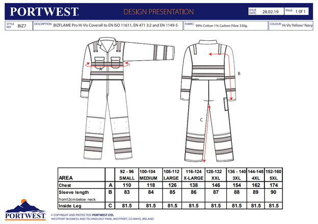 Portwest BIZFLAME - BIZ7, Costum din bumbac, 330 g/mp