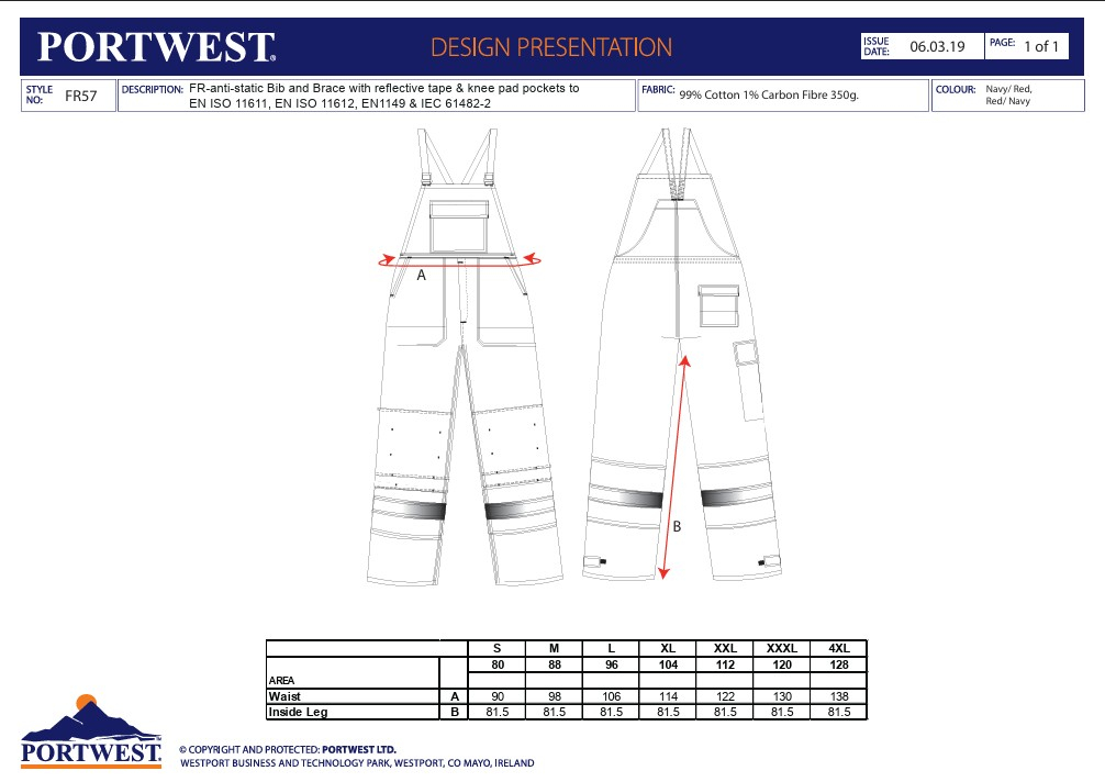 Portwest PORTWEST BIZFLAME - PLUS FR57, Pantaloni cu pieptar ignifugi, antistatici (ESD), din bumbac si fibră de carbon, 350 g/mp