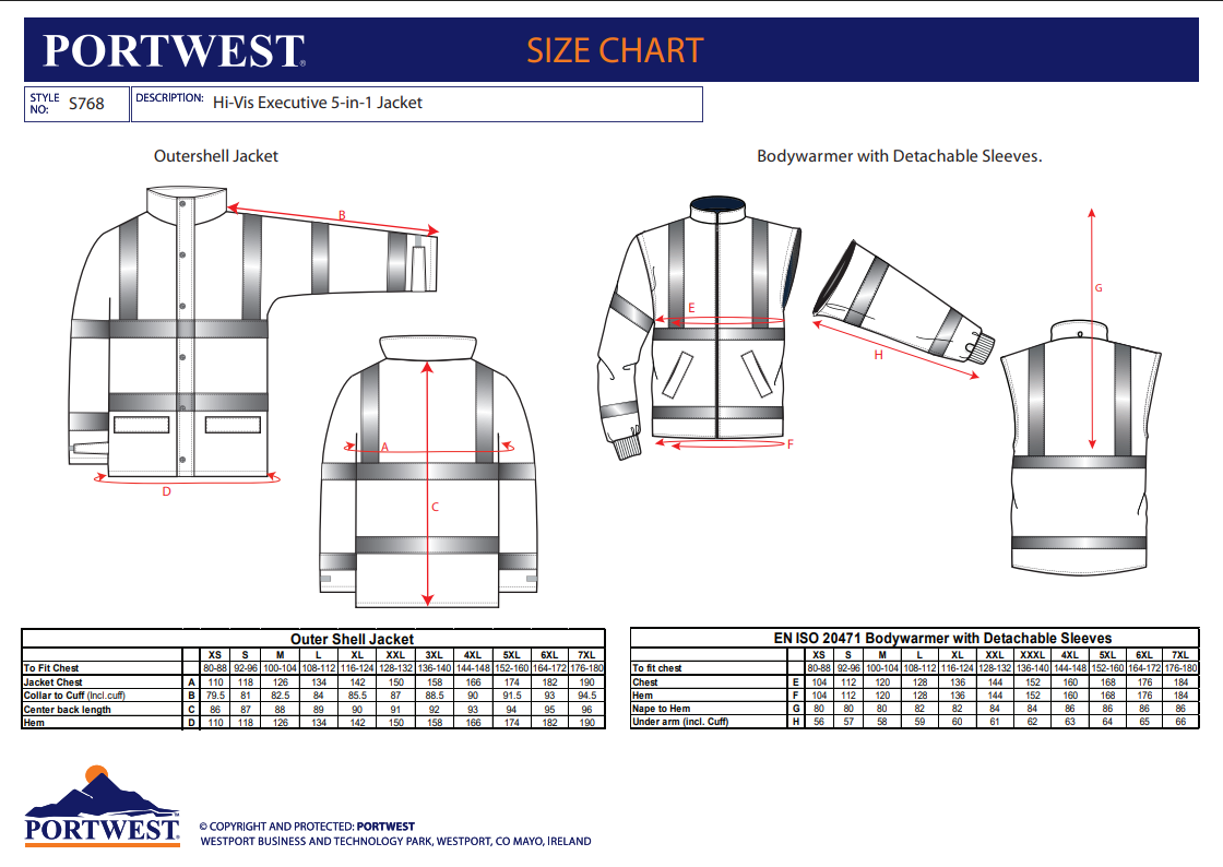 Consultați tabelul de mărimi Portwest pentru alegerea corectă (imaginea de ghid mărimi atașată).