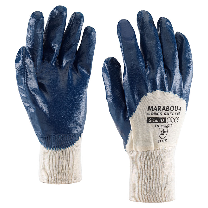 Mănușile MARABOU sunt confecționate din bumbac 100%, cu un strat de nitril galben aplicat pe palmă și spatele mâinii până la baza degetelor, oferind protecție împotriva abraziunii și rezistență la lichide. Designul cu manșetă tricotată asigură o fixare confortabilă și sigură. Recomandate pentru utilizare în aplicații mecanice, mănușile sunt certificate EN 388:2016, oferind protecție împotriva abraziunii (3), tăierii (1), sfâșierii (1) și perforării (1).