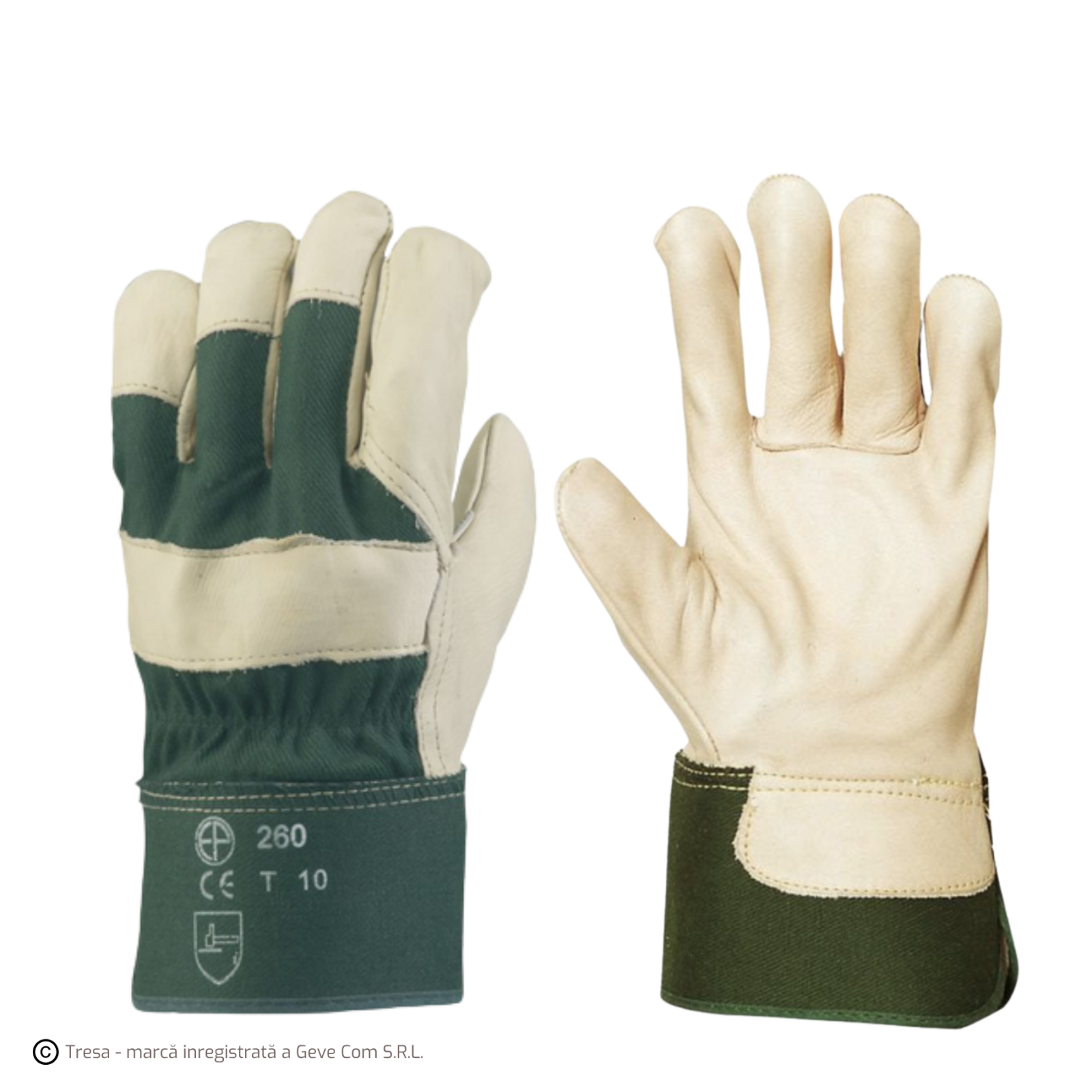 Mănușile EUROSTRONG 260 sunt realizate din piele integrală de bovină, moale și durabilă, cusută într-o singură bucată pentru rezistență sporită. Dosul palmei și manșeta sunt fabricate din pânză rezistentă verde, iar căptușeala interioară din bumbac asigură confort la utilizare îndelungată. Aceste mănuși sunt concepute pentru lucrări grele, oferind protecție eficientă pentru artere, unghii și osul pumnului.