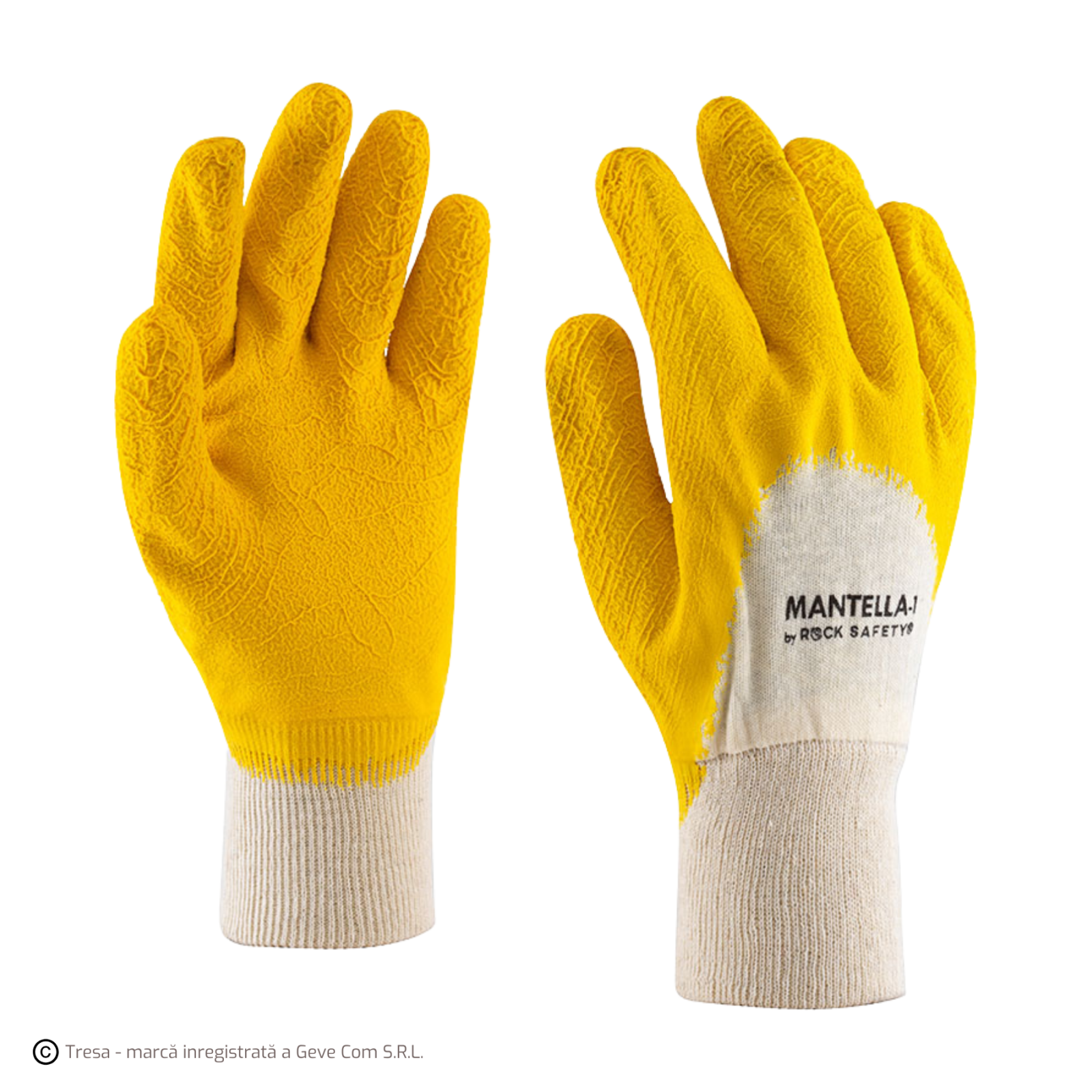 Mănușile MANTELLA-1 sunt realizate din 100% bumbac și oferă protecție mecanică de bază, fiind ideale pentru activități ușoare în medii uscate sau umede. Palma și spatele sunt imersate în latex galben, ceea ce conferă o bună aderență și rezistență sporită la uzură. Manșeta tricotată contribuie la o fixare fermă pe încheietură, iar modelul de acoperire oferă un plus de siguranță în manipulare.