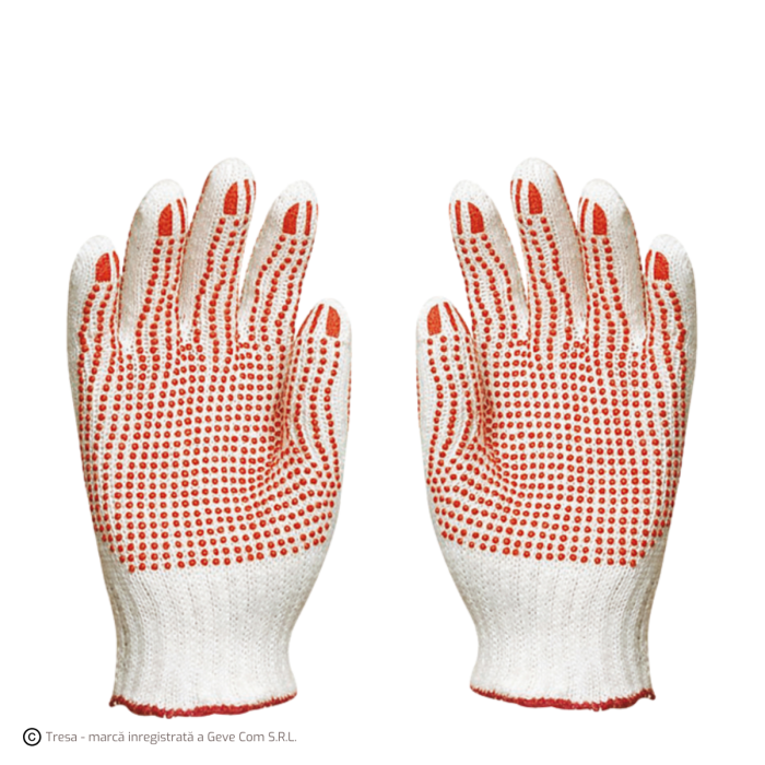 * Mănuși de protecție tricotate, cu patru fire, tricot de 7, din poliester / fire de bumbac * Buline antiderapante pe ambele părți * Se pot folosi pe ambele părți, ceea ce conferă o durată mai lungă de viață * Manșetă elastică
