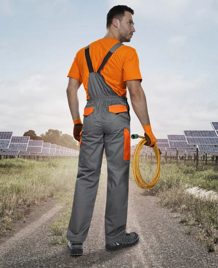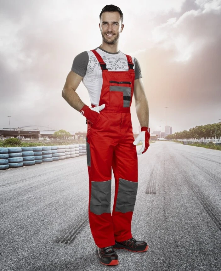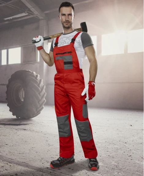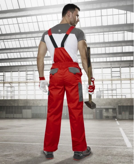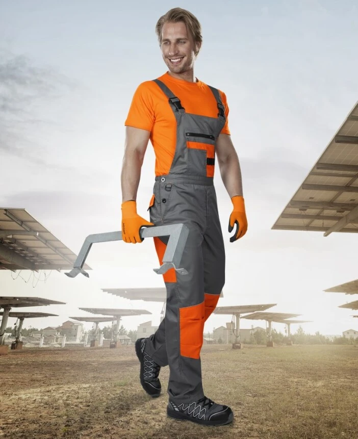 Pantaloni de lucru cu pieptar din colecția 2Strong, confecționați dintr-un amestec rezistent de poliester și bumbac. Materialul cu greutatea de 235 g/m² oferă durabilitate în mediul de lucru. Pantalonii sunt dotați cu elemente reflectorizante pentru vizibilitate sporită și au croiul regular fit pentru confort. Produsul respectă standardele EN ISO 13688:2013 și este certificat STANDARD 100 OEKO-TEX.