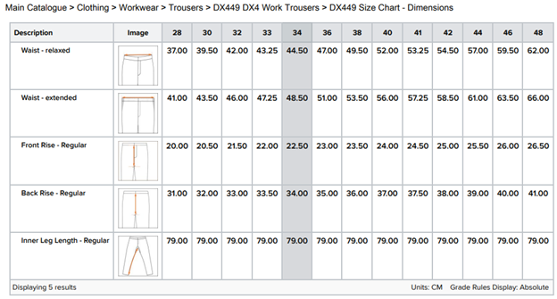 Mărimile disponibile sunt între 28 și 48. Consultați tabelul de mărimi Portwest DX449 pentru circumferința taliei și lungimea interioară a piciorului (79 cm). Croială slim fit, ergonomică, cu elastic lateral și talie înaltă.