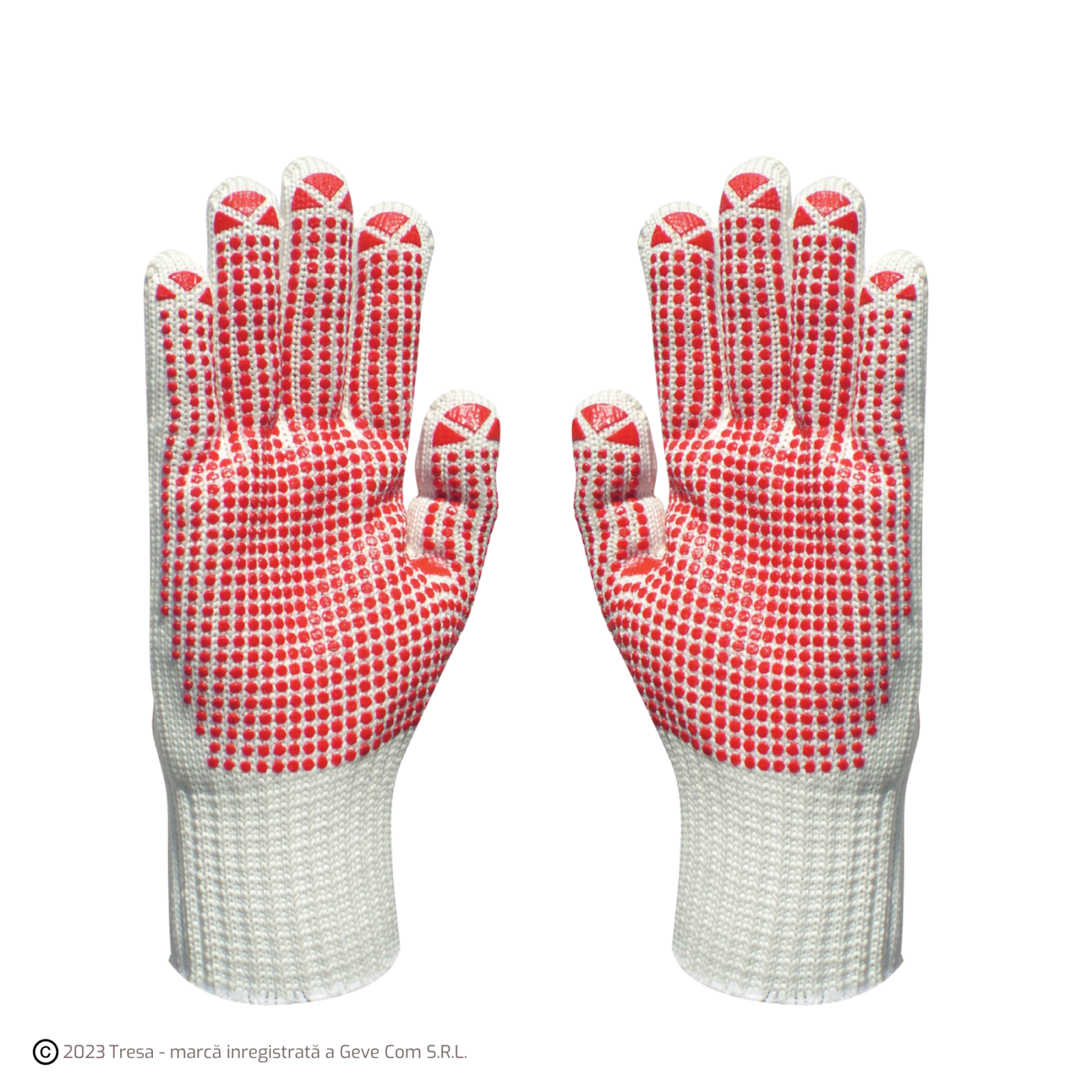 Mănușile GANSTRONG 4379 sunt concepute pentru activități generale și grele în medii uscate. Acestea sunt realizate din tricot de bumbac la interior pentru confort, combinat cu poliamidă la exterior pentru rezistență sporită. Modelul este fără cusături, cu un tricot de ecartament 7 și buline roșii antiderapante cu cap aplatizat pe palmă, asigurând o aderență excelentă la manipularea obiectelor.