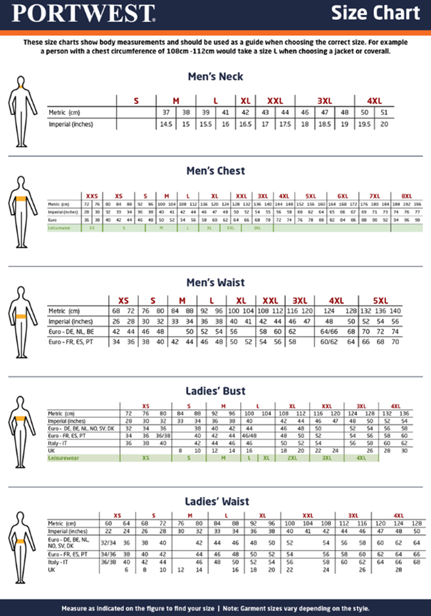 Disponibil în mărimi de la S la XXXL. Consultă tabelul Portwest de mărimi pentru alegerea corectă.